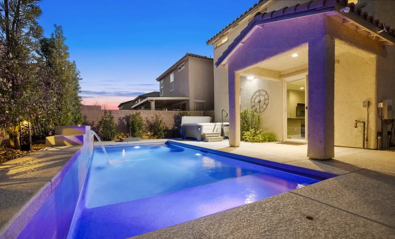 The home at 8923 Midnight Garden Ct in Las Vegas, Nevada is a two-story single-family residence built in 2015, offering 4 bedrooms, 3 bathrooms, and approximately 2,104 square feet of living space on a 5,227-square-foot corner lot. The property features an open-concept main floor with luxury vinyl flooring, a spacious kitchen with quartz countertops, stainless steel appliances, and an island with seating, along with a downstairs bedroom and full bath for added flexibility. Upstairs includes additional bedrooms and a loft area, while the backyard is designed for entertaining with a private in-ground pool built in 2020, an above-ground spa, and a built-in barbecue. Additional highlights include paid-off solar panels, a cooled two-car garage, a paver driveway, and easy-care desert landscaping, all located in the southwest Las Vegas area near Don and Dee Snyder Elementary School.